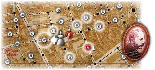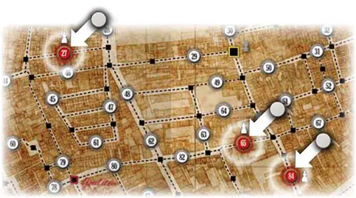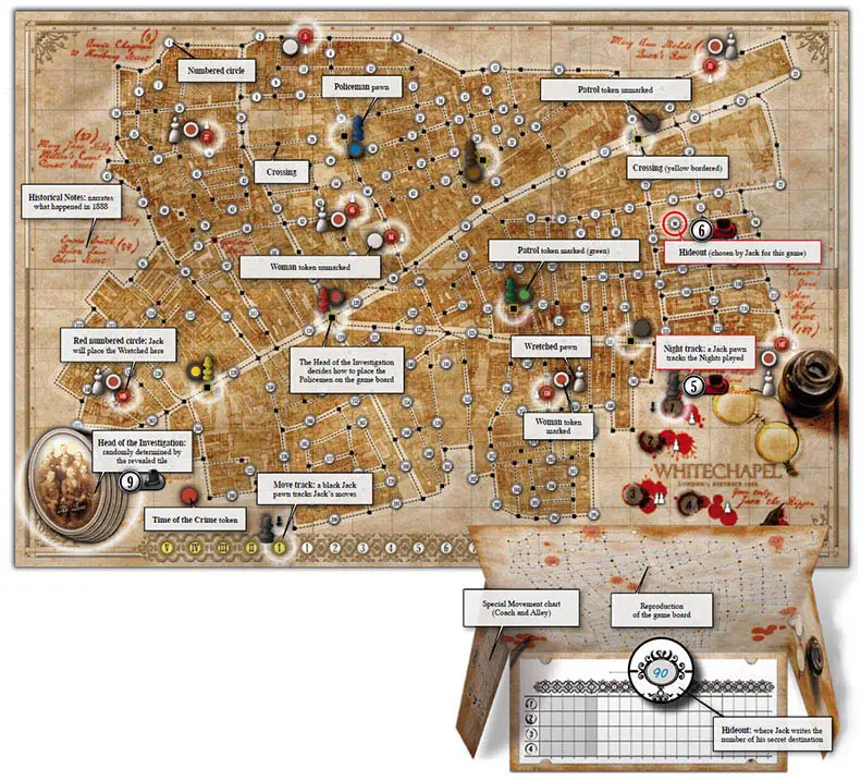 1. Place the game board representing whitechapel at the time of Jack the Ripper at the center of the table. It is marked with 195 numbered circles linked together by dotted lines.