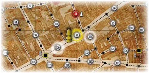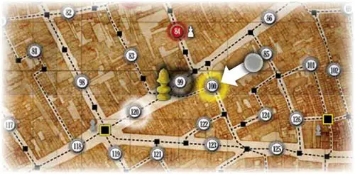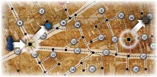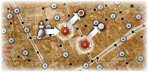 Both types of actions can be undertaken in the numbered circles adjacent to that policeman pawn (i.e., in the numbered circles directly connected by dotted lines to the crossing where the policeman pawn is located). There cannot be an intervening crossing on the dotted line connecting the crossing the policeman pawn is on and the circle he wants to search for clues or make an arrest in.