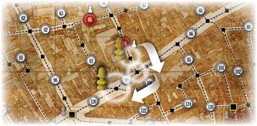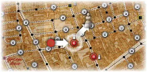 Jack is on numbered circle 103 and decides to use a Coach. Jack secretly chooses and records the two numbered circles involved in the movement: first 69, then 56. Now Jack is on numbered circle 56, but one of his Special Movements for the Night has been expended. He places a Coach token to cover two spaces on the move track, as a reminder for the detectives. He moves his Jack pawn two spaces on the move track. Hooves clatter on the cobblestones: few people can afford a coach in London..