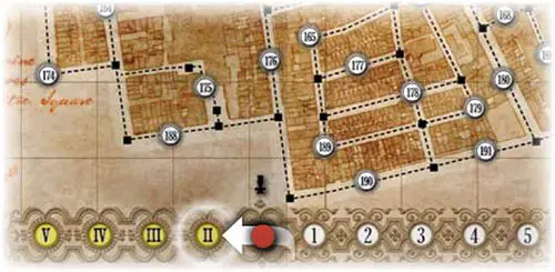 First, the Time of the Crime token is moved on to the next yellow Roman numeral in ascending order. Then, the Head of the Investigation must move each of the wretched pawns on the game board. Each one must move along dotted lines to an adjacent, unoccupied numbered circle.