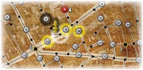 Note: on the second and subsequent Nights of the game, Jack cannot place woman tokens on the red numbered circles occupied by red crime scene markers.