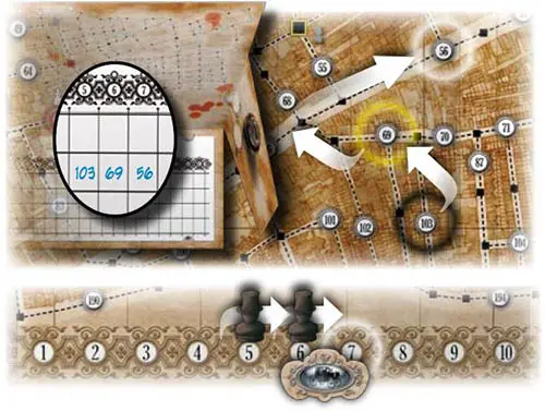 Jack makes his move from numbered circle 127 (his previous location) to numbered circle 103. He writes the new number on his sheet in the next available space. Then he moves the Jack pawn one space rightward on the track on the game board. Jack skulks down Whitechapel streets, hidden in the shadows...