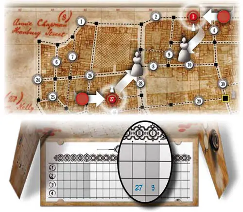 On the third Night, Jack chooses two victims, placing Crime Scene markers on each of the numbered circles 3 and 27. He secretly records on his sheet "27" and then "3". His second (rightmost) victim is the one on numbered circle 3, the location from which he'll begin his escape... But the detectives don't know which one is the correct one!