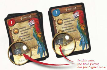 Each character card has a name and a rank. The rank is written at the top left of the card and goes from 1 to 30. The higher the value, the more important the rank. The character with the highest rank is the Spanish governor. The one with the lowest rank is the parrot (one of the captain's mascots).