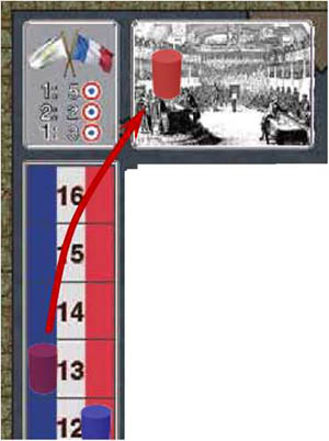 The red election marker is moved up 3 spaces on the Election Track. As there was a tie, all remaining faction blocks, including the white block, are removed from the province and returned to the supply. Christie discards the advanced Marat.