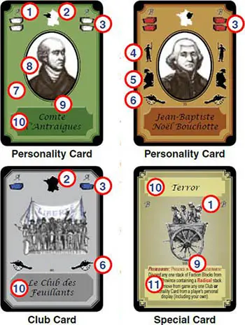 The cards are divided into two sets. The A-set, which enters play first, favors the Moderates and Royalists while the B-set favors the Radicals. There are three types of cards: