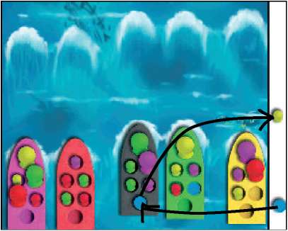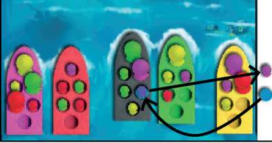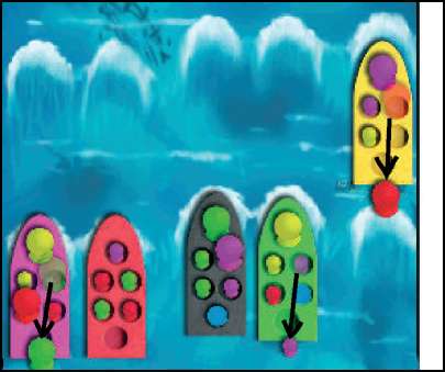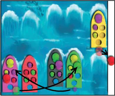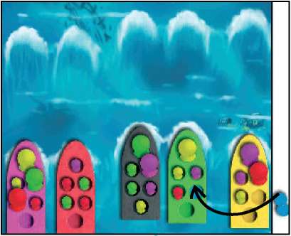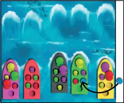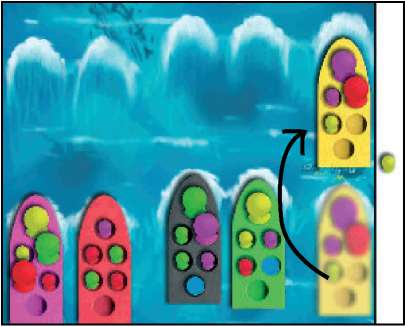 position any of his seamen at the stem of a lifeboat, he may not move any of his pawns. Player 3 relocates his sailor from the green boat into the purple boat.