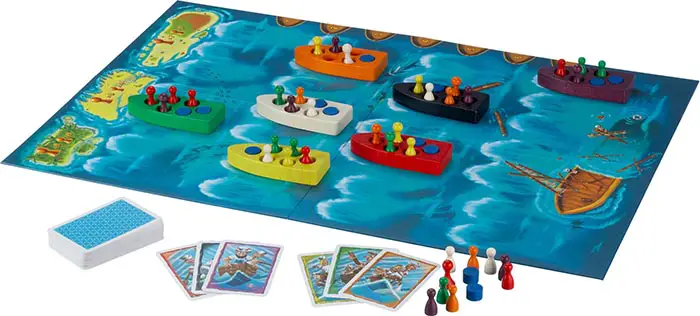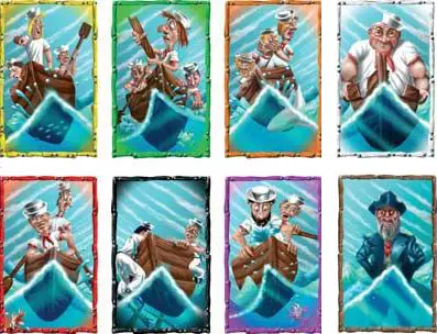 The board is placed in the middle of the table. Every player chooses a color and takes the lifeboat, the two officers (bigger pawns) and the five sailors (smaller pawns) of their chosen color.