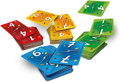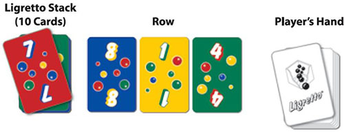 Row: Players deal another three cards in a Row to the right of the Ligretto Stack, with the numbers face up. If there are only two players, players deal five cards into the Row. With three players, players deal four cards into the Row.