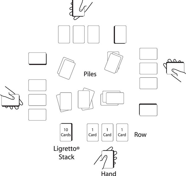 Ligretto Stack: Players deal 10 cards face down into a stack in front of themselves and then turn the stack over to reveal the numbers.