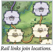 Some or all army counters in one location along one rail link into an adjacent location OR