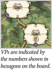 VPs are indicated by the numbers shown in hexagons on the board. Only the Union player counts VPs. They are gained for complete control of a location and by the position of the marker on the Blockade track.