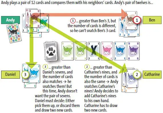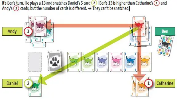 If the card(s) played by the current player match(es) the number of cards at the top of another player's stack and the number on the card(_) is greater, the stacked cards must be snatched! If the current player snatches stacked cards from more than one player, they do so in a clockwise direction.