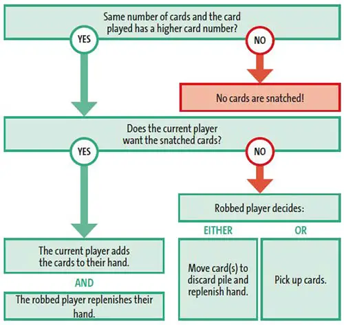 After snatching cards from the player to their left, the current player checks the stacks of the other players, one after the other in a clockwise direction, to see if they can also snatch their cards. (It's possible to snatch cards from multiple players in a single turn, but a player may not be robbed multiple times on a single turn).
