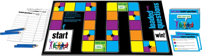 Place the board and box of question cards in the middle of the play area. Select game pieces and place them on the START space.