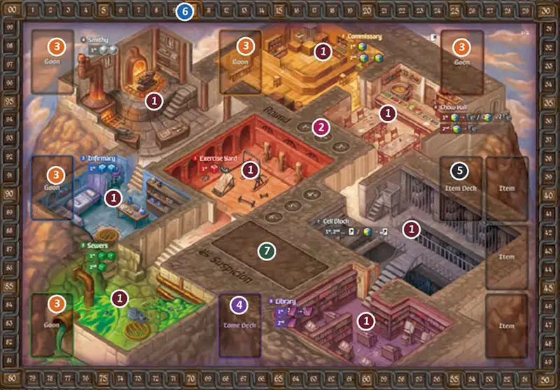 1 Locations: The prison has eight numbered locations: the EXERCISE YARD, the SEWERS, the INFIRMARY, the SMITHY, the COMMISSARY, the CHOW HALL, the CELL BLOCK, and the LIBRARY. Players will assign their crew tokens to these locations.