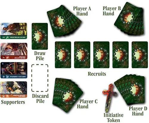 Once every eligible player has claimed their Supporters, discard any remaining Supporters, all Recruits, and all Followers.