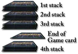 Insert the End of Game card into the shuffled deck as follows. Divide the deck into 4 roughly equal stacks, and place the End of Game card on top of the 4th stack. Then place the other 3 stacks on top, place the draw pile beside the board, and you're ready to begin.