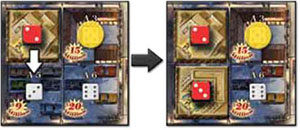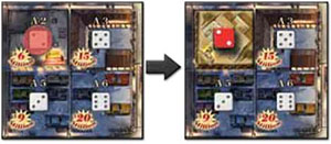 - In that tile, place one of your dice turned so that the lot's die value is face up.