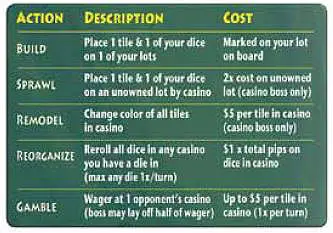 Strategy: You can use a remodel to change the likelihood of your casino's color being drawn. You can remodel to merge several small casinos that you control into one larger one, or to join your casino with a neighbor's casino. Such a "hostile takeover" can be a handy way to become the boss of someone else's property.