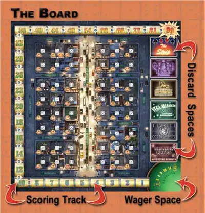 The Board: The board represents a abstract section of Las Vegas Boulevard ("The Strip"). Each square on the board begins as an unowned space called a "lot". You own each lot that contains 1 of your markers (your owned property).