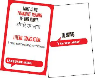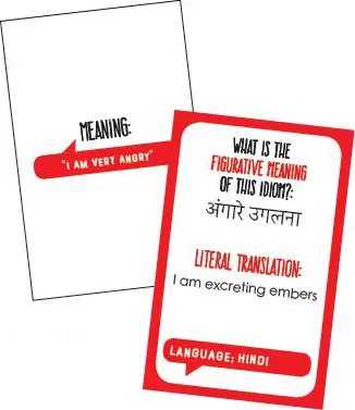 Players are shown an idiom in another language and the English literal (word-for-word) translation. Players must guess what the idiom actually means.