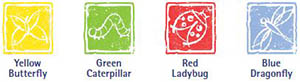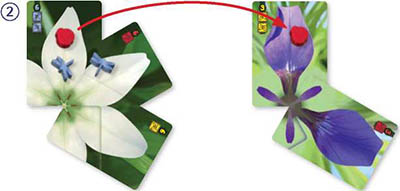 Example: Player 2 (Blue Dragonfly) places the last Petal Card on the flower, so he collects the seven Petal Cards for victory points. Player 1 (Red Ladybug) has control of the flower and earns the choice of a Scoring Token or Special Power.