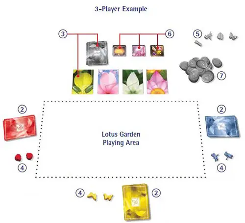 (1) Select a Guardian/Color: Players each select the type of Guardians which will help them gain control of the Lotus Garden during the game.