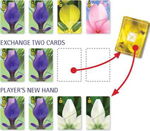 After a player has completed his two actions, he draws enough Petal Cards to bring his hand total back up to four cards, then his turn is over. He may choose to draw from his own Player Deck or from the Wildflowers, or a combination of both. If the player already holds four cards, he does not draw and his turn is over.
