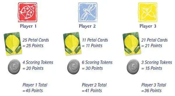 bach player adds all of their Scoring Tokens earned and Petal Cards collected during the game, disregarding the number and Guardian symbols in the upper left of Petal Cards.