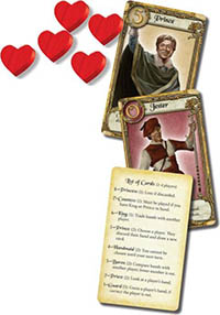 The red, heart-shaped tokens are used to track Princess Annette's ever-growing affection for those suitors whose letters reach her. One of the tokens is not red. It is the Jester token, which is given to a player when they have been chosen by the Jester card effect.