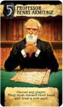 When you discard Professor Henry Armitage during your turn, choose a player (including yourself). That player discards their hand (but doesn't apply its effects, unless it is the The Necronomicon or Cthulhu) and draws a new card. If the player cannot draw a card due to the deck being empty, they draw the card that was removed at the start of the round.