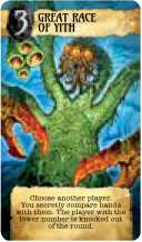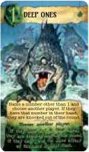 When you discard Deep Ones during your turn, choose another player. If they have a 1 in their hand, they are knocked out of the round. If they do not, you name a number (other than 1). If they have that number in their hand, they are knocked out of the round.