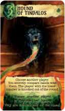 When you discard Hound of Tindalos during your turn, choose another player. If they are not Insane, they are knocked out of the round. If all other players still in the round cannot be chosen (e.g due to Elder Sign or Liber Ivonis), this card is discarded without effect.