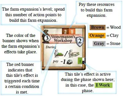 To build a farm expansion, spend action points equal to the farm expansion's level and pay the resources shown on the top-right of the tile.