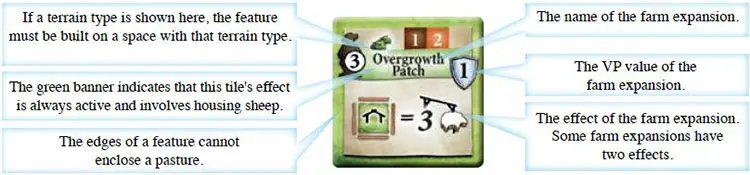 Take the faceup farm expansion tile from the display and place it on an empty space (without sheep or another farm expansion) on your farmyard. Some farm expansions can be placed only on spaces with specific terrain (bushes, a tree, or a lake), which is shown on the left of the resource cost.