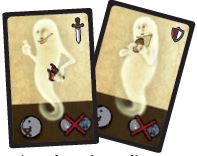 The two players with the sword and shield cards each place their card face down in front of any player that is still alive (the same or different players), after briefly... and silently... discussing their choice with all of the other ghosts.