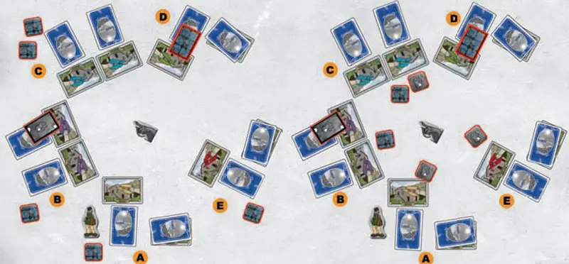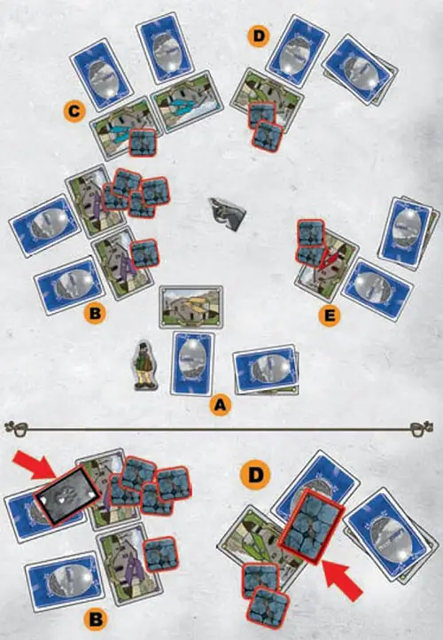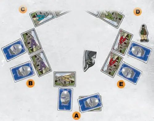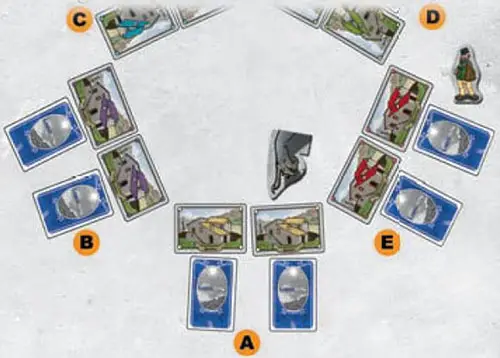 Each player lays his two houses face up in front of him so that they form a circle as shown in the picture below. Only the owner knows which of these two houses hides his precious treasure chest!