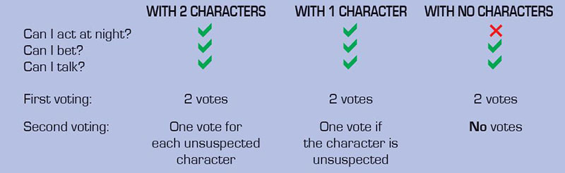 Players with two voting tokens may freely choose to vote twice for the same suspect or to split their votes. Players may even vote for one of their own suspected characters.