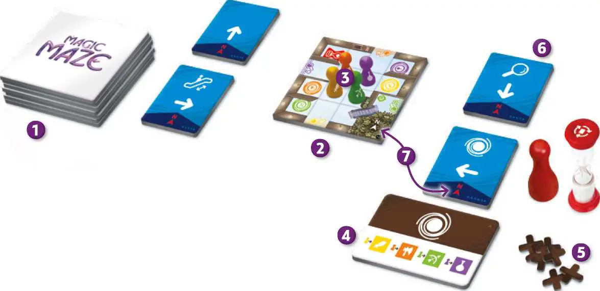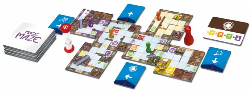 Magic Maze is a real-time, co-operative game. Each player can control any of the 4 Hero pawns whenever he wants in order to make that hero perform a very specific action, to which other players do not have access: move north, explore a new area, ride an escalator… all of this requires rigorous co-operation between the players in order to succeed at moving the heroes wisely, and complete your mission before the sand timer runs out.
