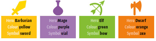 - 1 sheet of stickers to stick on the Hero pawns (if you wish) which allows people with altered colour perception to recognise them.
