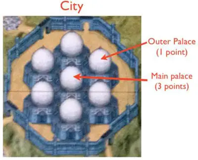 Only 7 Palaces may be built in any 1 City. The number of Houses in Cities is not restricted. Each Palace cost $12 whether it is the Central palace or not.