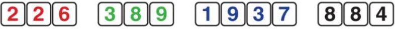 - Four colors of Tiles from 0 to 9 (30 Red, 30 Blue, 30 Green, 20 Black)