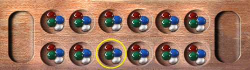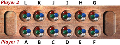 Players move alternatively in a series of "laps". During a turn, a player removes all of the stones from one cup or hole and then places them one by one in the cups around the