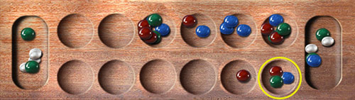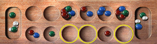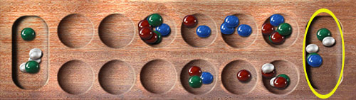 Now, play from your rightmost or second-rightmost hole. Either of these moves will drop a stone into your opponent's third hole blocking him to make the same opening move.