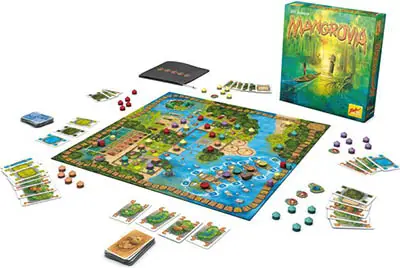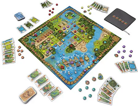 Shuffle the landscape cards. Each player gets 2 of them and takes them into his hand. Put the remaining landscape cards as a face-down draw pile next to the gameboard. Reveal three landscape cards and lay them out next to one another.