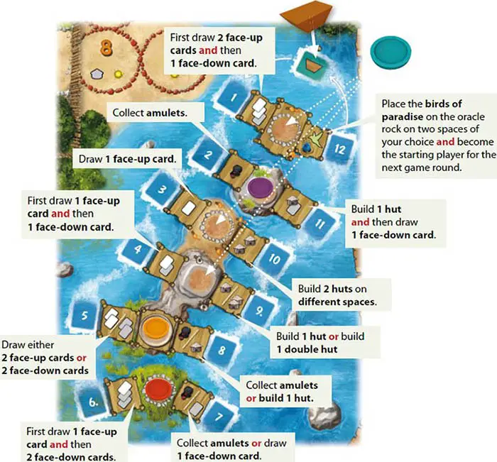 With your amulet pillar on the amulet track, you mark the number of huts you have on the red-encircled amulet spaces. The more huts you have built on amulet spaces, the more amulets you are allowed to collect. Lay down the amulets you have collected face-down in front of you.