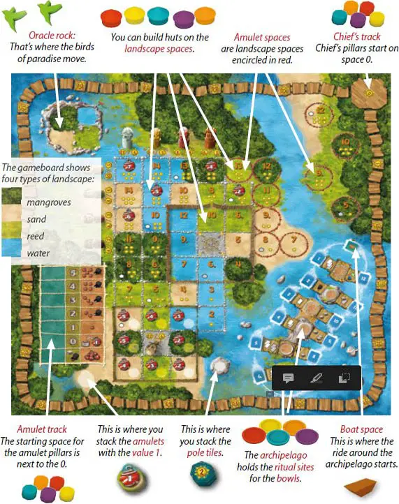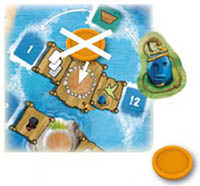 In the two- and three-player game, each player, in turn, then also places his second bowl on a free ritual site. In this case, the starting player may not place his first bowl on the first ritual site of the archipelago (landings 1/12). However, he may place his second bowl there, provided this site is still unoccupied.