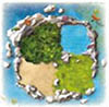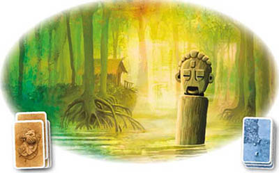 There are two double-landscape spaces on the gameboard, each of them consisting of two landscapes. If you build a hut on such a space, the landscape card you pay with has to correspond to one of the landscapes (of the space in question). This type of landscape must be occupied by one of the birds on the oracle rock.