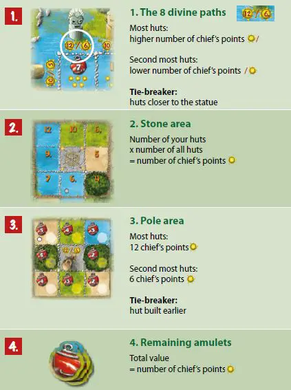 The numbers in front of the statues indicate how many chief's points the players get for having built the most and second most huts on the respective path. In case of a tie (same number of huts), the player whose hut is closer to the statue of this path wins.